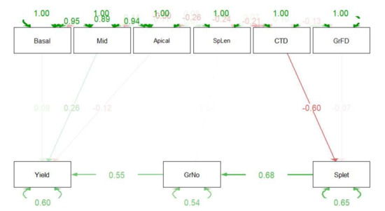 Structural equation modeling (SEM) analysis [38] was carried out with a whole set of data generated in the present experiment to assess the influence of different parameters on the grain yield performance of genotypes. Standardized values were used for the analysis with the initial assumption that yield spike−1 is a function of grains spike−1 and grain weight represented by weights of basal, middle, and apical grains. In addition, it is assumed that grains spike−1 is a function of spike length and spikelets spike−1 while spikelets spike−1 is the function of grain-filling duration and CTD.