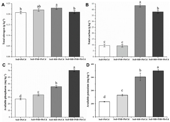 Nutrient element contents in soil with different treatments ((A): Total nitrogen, (B): Total carbon, (C): Available phosphorus, (D): Available potassium, RB—rice husk biochar, PSB—Enterobacter sp.). Different letters indicate significant differences among treatments.