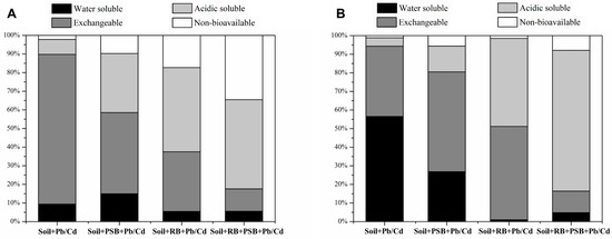 Speciation of toxic heavy metals Pb (A) and Cd (B) in soils (RB—rice husk biochar, PSB—Enterobacter sp.).