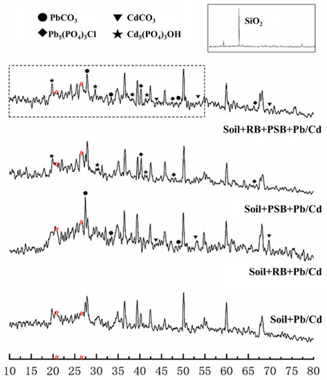 The results of XRD showed that there were obvious toxic heavy metal minerals in the soil after remediation (Figure 4). The peaks at 44.35°, 47.73° and 67.12° and the peaks at 19.11°, 29.74° and 41.60° in Soil + PSB + Pb/Cd confirmed that Pb and Cd existed primarily as phosphates [11]. The characteristic vibrational sorption peaks of Pb carbonate (27.54°, 33.21°, 47.95°) and Cd carbonate (45.22°, 52.57°, 72.98°) were observed in the Soil + RB + Pb/Cd and Soil + RB + PSB + Pb/Cd [22]. The characteristic peaks of Pb and Cd minerals in the soils remediated by biochar and PSB were significantly more numerous and more clearly defined than those of biochar or PSB applied alone. In the infrared spectrogram, it is difficult to find the characteristic peaks of Pb/Cd minerals produced after the remediation of toxic metals by PSB because the soil makes up the majority of the sample (Supplementary Information, Figure S2).