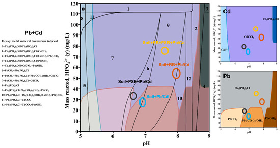 The GWB model can simulate the final form of heavy metal minerals in the environment. The mineral assemblage diagrams, as a function of pH and H2PO4− activity, revealed that mineral species of Pb or Cd are theoretically present in the phosphate–carbonate system (Figure 5). The range of different treatment methods in the model can prove the difference between different treatments on the formation of Pb/Cd-coexisting minerals. Soil + Pb/Cd was in interval 6 or 9, the dominant minerals include Pb3(CO3)2(OH)2 and CdCO3. Soil + PSB + Pb/Cd was in interval 6, and PbCO3, Pb5(PO4)3Cl and CdCO3 were its main minerals. The decrease in pH and the increase in P content by PSB are conducive to the formation of Pb-phosphate. Soil + RB + Pb/Cd was in interval 9 or 10, including four coexisting minerals (Pb5(PO4)3Cl, Pb3(CO3)2(OH)2, CdCO3 and Pb(OH)2). Soil + RB + PSB + Pb/Cd was in interval 9, of which Pb5(PO4)3Cl and CdCO3 were the most important minerals. The H2PO4− content of Soil + RB + PSB + Pb/Cd was higher than that of Soil + RB + Pb/Cd, and the pH was lower than that of Soil + RB + Pb/Cd, which made the minerals that formed in Soil + RB + PSB + Pb/Cd dominated by Pb5(PO4)3Cl and CdCO3. In the mixed system of Pb and Cd, there is obvious competition between Pb and Cd, and the formation of Pb-phosphate is obviously better than Cd-phosphate. According to a single-phase diagram, CdCO3 was the main mineral, forming at 5.5 < pH < 8.7 and H2PO4− > 0 mg/L. As the P concentration increases, Cd5(PO4)3OH might occur when pH > 8.5 and with more P (>40 mg/L). However, reactions in the system trended to form less Pb5(PO4)3Cl with increasing pH when the initial P concentration was fixed (see Pb in Figure 5). This means that when the soil pH is 5–8, Pb is more likely to preferentially form minerals. Meanwhile, when P is sufficient, the minerals formed by Pb are more stable. Although the effect of pH on the stability of Pb and Cd minerals is opposite in our reaction system, the higher the P content, the more conducive the final minerals are to form Pb/Cd-phosphate, which indicates that the P content is the key factor for determining the final formation of stable minerals.