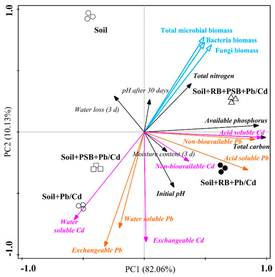 Based on the principle that the larger loading coefficients of variables in the PCA plot indicate relatively greater influence of variables on PC, it means that PC1 mainly responds to some biological activity-related properties and PC2 mainly responds to some chemical–physical-related properties. The environmental factor analysis results reveal that most environmental factors were negatively correlated with the Soil + Pb/Cd and Soil + PSB + Pb/Cd treatments. The total carbon, available phosphorus and total nitrogen and microbial factors (bacteria, fungi and total microorganisms) were the most correlated with the Soil + RB + PSB + Pb/Cd treatment. Meanwhile, the positive correlation and location between the Soil + RB + PSB + Pb/Cd treatment and environmental factors were significantly stronger than those between the non-contaminated soil and environmental factors, which confirmed that the soil remediated with PSB and biochar could recover the soil biological characteristics in a short time, and that even the physical and chemical characteristics were better than non-contaminated soil.