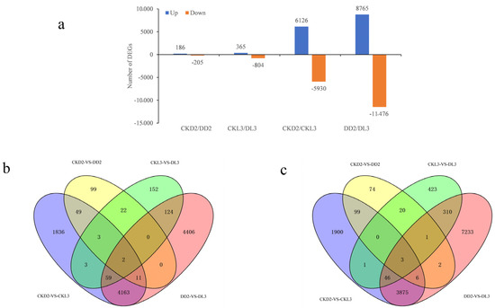 Analysis of differentially expressed genes (DEGs): (a) DEGs in four comparisons; (b) Overlapping upregulated DEGs in four comparisons; (c) Overlapping downregulated DEGs in four comparisons.
