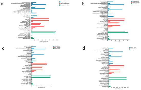 Gene ontology (GO) classifications of differential expression genes in four comparisons. Results are summarized in three main GO categories: biological process, cellular component, and molecular function: (a) CKD2/DD2; (b) CKL3/DL3; (c) CKD2/CKL3, and (d) DD2/DL3.