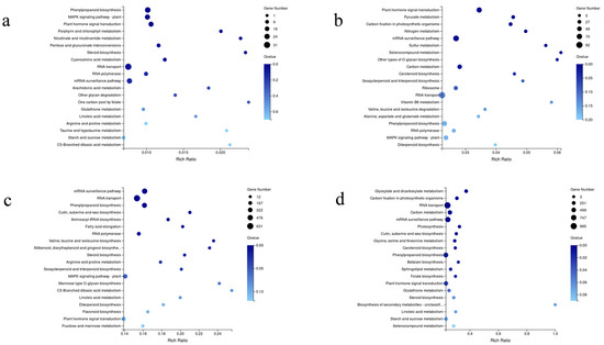 GO enrichment analyses were performed on the DEGs in different comparisons. The number of GO terms assigned into the four comparisons were 39 (CKD2/DD2) (Figure 3a), 47 (CKL3/DL3) (Figure 3b), 52 (CKD2/CKL3) (Figure 3c), and 54 (DD2/DL3) (Figure 3d), respectively. The most enriched GO terms under the three main GO classification systems were the cellular process, cell, and binding in the CKD2/CKL3, CKD2/DD2, and DD2/DL3 comparisons, while in CKL3/DL3 were cellular process, cell, and catalytic activity. The enrichment of DEGs in different GO terms clearly indicated the molecular and cellular events in different oat varieties under drought stress. A KEGG enrichment analysis of DEGs was performed to reveal further the changes in the biological pathways of different oat varieties in response to drought stress. The results showed that the main enriched pathways in CKD2/DD2 comparison were phenylpropanoid, MAPK signaling pathway-plant, and plant hormone signal transduction (Figure 4a). CKL3/DL3 comparisons were plant hormone signal transduction, pyruvate metabolism, and carbon fixation in photosynthetic organisms (Figure 4b). CKD2/CKL3 comparisons were mRNA monitoring pathway, RNA transport, and phenylpropanoid biosynthesis (Figure 4c). DD2/DL3 comparisons were glyoxylate and dicarboxylate metabolism, carbon fixation in photosynthesis organisms, and RNA transport (Figure 4d). The above-enriched pathways may be essential for oat survival under drought stress.