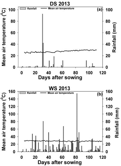 Mean air temperature (°C) and rainfall (mm) during the whole growth period. (a) Mean air temperature (°C) and rainfall (mm) during dry season; (b) Mean air temperature (°C) and rainfall (mm) during wet season.