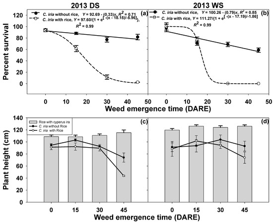 Influence of weed emergence time on C. iria percent plant survival (a,b) and plant height (c,d) of C. iria and rice. Models fitted to the data for C. iria grown without rice interference (Rice 0) are shown by solid lines, and those fitted to the data for C. iria grown with rice at the rate of a 50 kg ha−1 seed rate (Rice 50) are shown by broken lines. The height of rice plants is shown by a bar graph. Equations are used to show the estimated parameters. The standard error of the means is represented by vertical bars.