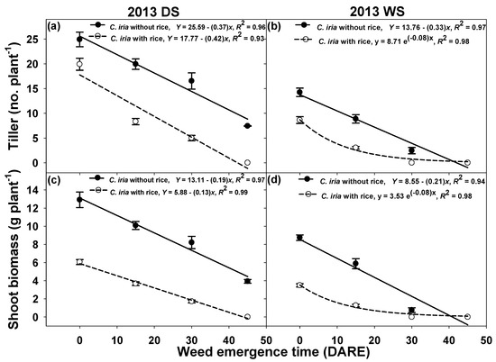 Regression curves (y = a + bx and y = a.e−bx) fitted to the tiller number (a,b) and shoot biomass (c,d) of C. iria. Models fitted to the data for C. iria grown without rice interference (Rice 0) are shown by solid lines, and those fitted to the data for C. iria grown with rice at the rate of a 50 kg ha−1 seed rate (Rice 50) are shown by broken lines. Equations represent the estimated parameters, and the standard error of the means is represented by vertical bars.