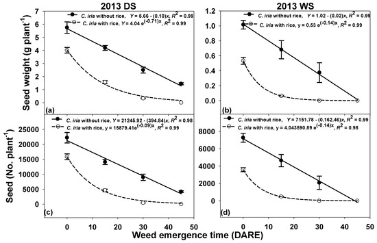 As with seed weight, the number of seeds per plant of C. iria decreased linearly when grown without rice during both seasons (Figure 4c,d). However, more seed production per plant of C. iria was observed in the DS than in the WS. Interference of rice reduced seed production (p 0.001). The number of weed seeds plant−1 greatly declined (p 0.001) for each successive delay in weed emergence in comparison with rice emergence. During both seasons, seed production was achieved when the emergence of weed was delayed up to 30 DARE in weed–rice interference plots and up to 45 DARE where weeds were raised alone (Figure 4a,b). Overall, C. iria seed production declined exponentially with delayed weed emergence along with rice interference (y = 15879.41 e−(0.09)x in the DS and y = 43590.89 e (−0.14) x in the WS) and linearly without rice interference (y = 21245.92 − (394.84)x in the DS and y = 7151.7 − (0.162.46)x in the WS). The maximum seed production (15,821–22,203 seeds plant−1 in the DS and 3589–7269 seeds plant−1 in the WS) of C. iria was observed in the cohort that emerged with rice. A significant and noticeable decline in seed production of C. iria was observed when weed emerged at 30 DARE compared with early-emerging cohorts (Figure 4c,d). However, a 100% decline in the seed production of C. iria was observed when the cohort emerged at 45 DARE in the presence and absence of rice interference. The decline in seed production owing to late emergence behaved similarly to weed biomass reduction.