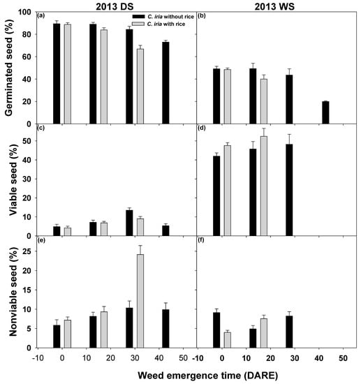 Effect of emergence time of weed in the dry (DS) and wet seasons (WS) of 2013 on C. iria per-plant seed germination (a,b), viability (c,d), and nonviability (e,f). Black bars show data for C. iria plants grown alone without rice plants (Rice 0), and grey bars show data for C. iria plants grown with rice at a seed rate of 50 kg ha−1 (Rice 50). The standard error of the means is represented by vertical bars.