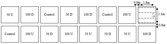 Experimental design with different N-fertilization levels: Control (0 kg N ha−1); 50 D (50 kg N ha−1 as digestate); 100 D (100 kg N ha−1 as digestate); 50 U (50 kg N ha−1 as urea); 100 U (100 kg N ha−1 as urea).