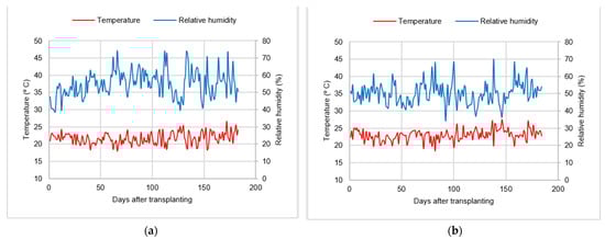 Figure 1 shows the data monitored in the greenhouse. In the first experiment, the average air temperature ranged from 17.9 to 26.5 °C (average value 21.6 °C) and relative humidity varied from 38.7 to 74.1% (average value 55.0%). In the second experiment, temperature ranged from 18.4 to 27.5 °C (average value 23 °C) and relative humidity varied from 34.0 to 69.7% (average value 50.0%).