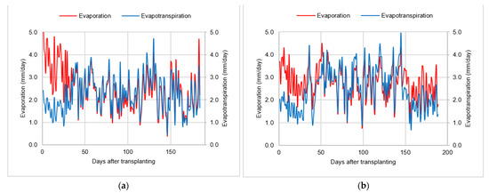 Daily evaporation and evapotranspiration inside the greenhouse. (a) first experiment, (b) second experiment.