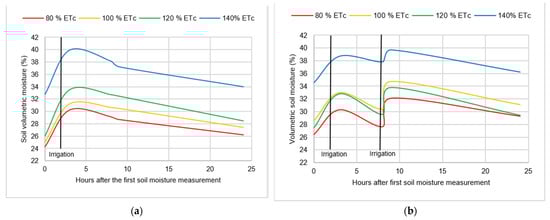 Daily evolution of soil water content. (a) One irrigation a day; (b) two irrigations a day.