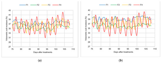 Temporal evolution of soil moisture. (a) 100% ETc; (b) 120% ETc. (F1: two irrigations a day, F2: one irrigation a day, F3: one irrigation every two days, F4: one irrigation every three days).