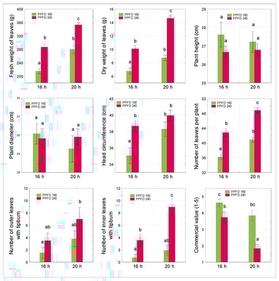 For cv. ‘Elizium’ (mini type Romaine lettuce) increasing PPFD from 160 to 240 µmol m−2 s−1 stimulated biomass production only at 16 h photoperiod and such a reaction was not noted with longer photoperiod (Figure 2). The highest fresh weight of leaves had the plants grown at longer photoperiod irrespective of PPFD as well as at 16 h photoperiod but only under higher PPFD (on average 239.3 g), i.e., from 11.5 to 17.3 mol m−2 DLI per day and the lowest at 16 h and under lower PPFD (191.3 g), i.e., at 9.2 mol m−2 DLI per day. Dry weight of leaves was the highest at 20 h photoperiod (on average 8.4 g) and the lowest at 16-photoperiod and lower PPFD (5.4 g). Moreover, plants grown under higher PPFD were smaller and had a smaller diameter than those grown under lower PPFD, regardless of the length of the photoperiod. Increasing DLI from 9.2 to 17.3 mol m−2 per day increased the number of outer and inner leaves with symptoms of tipburn, similar to the cv. ‘Casual’. The highest number of outer and inner leaves with tipburn was observed under high PPFD and long photoperiod, i.e., 17.3 mol m−2 DLI per day, respectively, 50 and 8% of all leaves, while under lower PPFD and 16 h photoperiod 9.2 mol m−2 DLI per day, the numbers of tipburn leaves were 4% (outer) and 0% (inner).