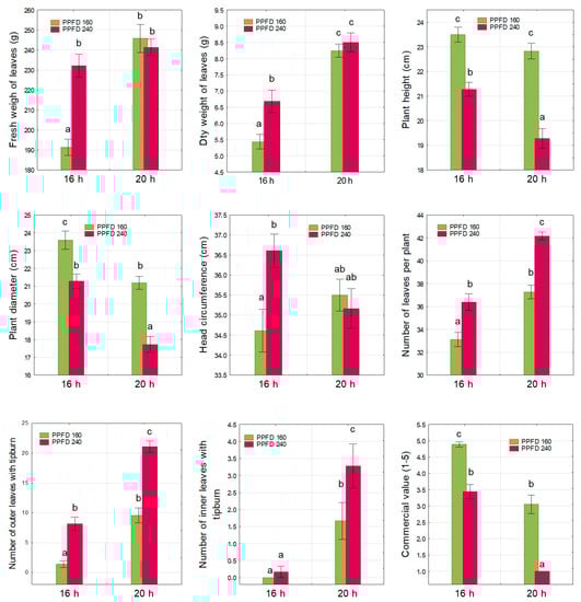 Fresh and dry weight of leaves, plant height, plant diameter, head circumference, number of leaves per plant, number of outer and inner leaves with tipburn, and commercial value of cv. ‘Casual’ romaine lettuce grown under different light environments (photoperiod 16 and 20 h and PPFD 160 and 240 µmol m−2 s−1). Bars represent means ± SE. Means followed by the same letter are not significantly different (p < 0.05) according to Tukey’s HSD test.