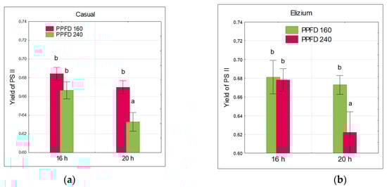 Quantum Photosynthetic Yield of PSII (Y) in light-acclimated romaine lettuce cv. ‘Casual’ and cv. ‘Elizium’ was essentially stable (≈0.67) at 16 h photoperiod irrespective of PPFD (160 and 240 µmol m−2 s−1), as well as 20 h photoperiod and 160 µmol m−2 s−1 PPFD (DLI in the range from 9.2 to 13.8 mol m−2 day−1) and significantly declined (≈0.63) in 20 h photoperiod and 240 µmol m−2 s−1 PPFD (DLI 17.3 mol m−2 day−1, Figure 3).