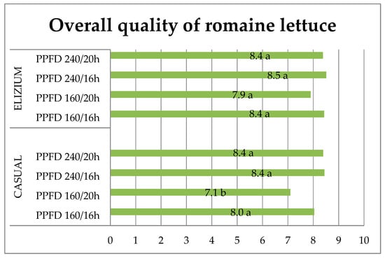 Comparison of the overall quality descriptor of romaine lettuce (scale 0–10 units). Means followed by the same letter are not significantly different (p < 0.05) according to Tukey’s HSD test.