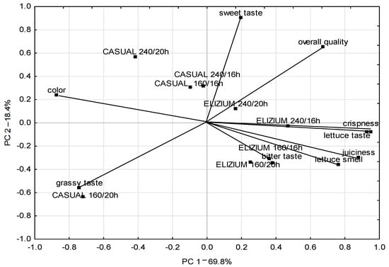 Principal component analysis (PCA) is a widely used multivariate analytical statistical technique. It was performed to synthetically determine the similarities and differences in sensory quality of romaine lettuce using the STATISTICA software ver.13.1. PCA was applied to QDA data to reduce the set of dependent variables (i.e., attributes) to a smaller set of underlying variables (called factors) based on patterns of correlation among the original variables []. When performing PCA, lettuce smell, color, crispness, juiciness, lettuce taste, sweet taste, bitter taste, grassy taste, and overall quality were included.