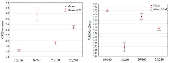 The average accuracy of discrimination of cv. ‘Elizium’ lettuce leaves from plants grown under different light environments was equal to 86.25% (Table 3) and was lower than for cv. ‘Casual’ (98.75%, Table 2). In the case of cv. ‘Elizium’ leaves (Table 3), none of the classes was 100% different from the others in terms of image textures. The highest accuracy of 90% was observed for classes 16/160 and 20/240. As many as 10% of cases belonging to class ‘20/240’ were incorrectly included in class ‘16/240’. Furthermore, 5% of cases belonging to class ‘16/160’ were incorrectly classified as ‘20/240’, and the remaining 5% as ‘16/240’. The accuracies of 85 and 80% were obtained for the samples of ‘20/160’ and ‘16/240’, respectively. In the case of both classes ‘20/160’ and ‘16/240’, 10% of incorrectly classified cases were included in the class ‘16/160’. Five percent of cases belonging to class ‘16/240’ were classified as ‘20/160’, and 5% of ‘20/160’ leaves as ‘16/240’. Additionally, 5% of cases from the class ‘16/240’ were incorrectly included in the class ‘20/240’. Exemplary image textures of cv. ‘Elizium’ lettuce leaves are presented in Figure 7. The mean values may differ between some classes. However, the differentiation for cv. ‘Elizium’ is less visible (Figure 7) than for cv. ‘Casual’ (Figure 6).