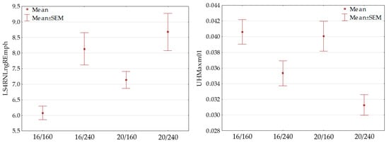 In the case of lettuce grown under a photoperiod of 20 h and PPFD of 160 µmol m−2 s−1 (20/160), the accuracy was equal to 95%, and 5% of cases were incorrectly classified as lettuce subjected to 20 h and PPFD of 240 µmol m−2 s−1 (20/240). For samples of 20/160 and 20/240, other metrics, besides FPR (0.017), were greater than or equal to 0.950. The graphs shown in Figure 6 confirmed that the mean values of selected textures can be completely different for each class of lettuce leaves.