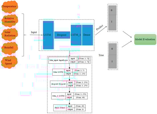 The model consisted of two LSTM layers: a dropout layer and a dense layer [27]. The LSTM defined a three-dimensional shape (none, 1, 5) of the input dataset, and conducted preliminary learning on many input data by increasing the number of neuron nodes (none, 1, 256). None (none, 1, 5) represents the number of each time input datum, 1 represents a label category (disease occurrence or absence) and 5 represents the number of five features (five independent variables we selected). Additionally, 256 represents the number of defined network units. The dropout layer is a regularization operation on the network, which contains useless information network units that are randomly hidden or discarded during the training process to prevent the model from overfitting. The LSTM_1 had the same scale as the LSTM layer after regularization; it stored, memorized and classified information related to the features and labels of the training dataset, and saved the remaining network units for data dimensionality reduction (none, 48). The dense layer is a fully connected layer, which allowed for the mapping of the feature classification results (none, 1) of the upper network through non-linear changes to the output space to improve the classification accuracy of the model. Figure 2 shows the structure of the hot pepper disease occurrence prediction model.