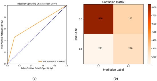 As shown in Figure 4, AUC = 0.6699 indicates that the model classification effect was effective; according to the confusion matrix, the ordinate and abscissa were actual disease absence (0) and disease occurrence (1), and predicted disease absence (0) and disease occurrence (1), respectively. The total number of datasets was 4819 points. The total number in the four matrices was the number of test dataset 1446 points (where TN = 836, TP = 228, FN = 271 and FP = 111). As shown in Table 1, Equation (3) and Figure 4b, the model prediction accuracy was 0.74.