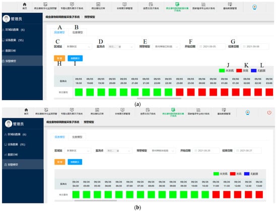 Interface of the hot pepper disease and pest forecast system in Guizhou. (a) Powdery mildew forecast interface; and (b) Anthracnose forecast interface. (A) Disease model; (B) Pest model; (C) Regional stations; (D) Monitoring points; (E) Early warning model; (F) Start date; (G) End date; (H) Provide an early warning; (I) Map display; (J) Disease will not occur; (K) Disease will occur; and (L) No data.