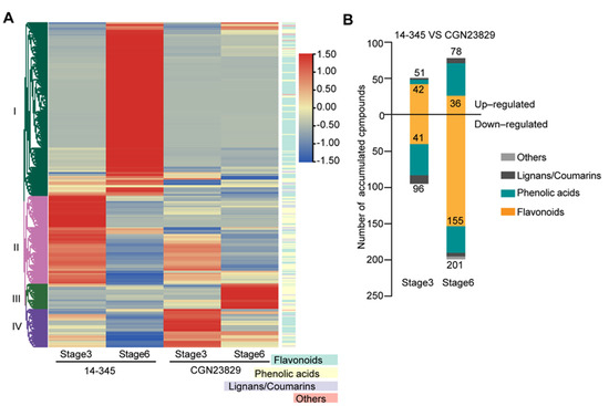 Overview of phenylpropanoid metabolite profiling in the fruit peel of ‘14-345’ and ‘CGN23829’. (A) Hierarchical cluster analysis of all the compounds detected in this study; (B) differentially accumulated metabolites at the two stages.