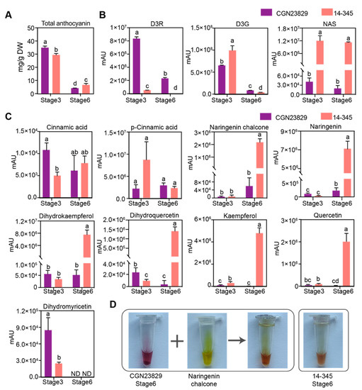 Flavonoid metabolite contents in the fruit peels at the commercial (Stage 3) and physiological (Stage 6) stages of ‘CGN23829’ and ‘14-345’. (A) Total anthocyanin content; (B,C) relative abundance of cinnamic acid, p-cinnamic acid, naringenin chalcone, naringenin, dihydrokaempferol, dihydroquercetin, kaempferol, quercetin, dihydromyricetin, D3G (delphinidin-3-glucoside), D3R (delphinidin-3-rutinoside), D3R5G (delphinidin-3-(p-coumaroyl) rutinoside-5-glucoside)/nasunin (NAS); and (D) Comparison of anthocyanin extracts from fruit peel of ‘CGN23829’ and ‘14-345’ at Stage 6. Different lower letters indicate significant differences according to Student’ s t-test (p < 0.01).