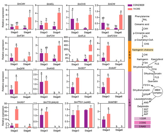 SmC4H and Sm4CL are located in the core part of the phenylpropanoid pathway. While SmC4H and Sm4CL showed comparable expression in ‘14-345’ and ‘CGN23829’ at Stage 3, their expression levels were significantly higher in ‘14-345’ than in ‘CGN23829’ at Stage 6 (Figure 4). The expression level of EBGs did not show a significant difference between the two genotypes at Stage 3; however, SmF3H was upregulated in ‘14-345’. However, the EBGs, including SmCHS, SmCHI, SmF3H and SmF3′H, were observed to be more highly expressed in ‘14-345’ than in ‘CGN23829’ at Stage 6 (Figure 4). The LBGs, except SmANS, were upregulated in ‘14-345’ compared with ‘CGN23829’ at Stage 3 and barely expressed at Stage 6. It is worth noting that SmF3′5′H showed no expression at Stage 6 in either genotype. Furthermore, no dihydromyricetin was detected in either genotype at Stage 6 (Figure 3 and Figure 4). In addition, the expression level of regulatory genes, including SmMYB1, SmTT8 and SmTTG1, also showed no significant difference between the two genotypes. Of note, while SmTTG1 showed high expression, SmMYB1, SmTT8 and LBGs were barely expressed at Stage 6 in either genotype.