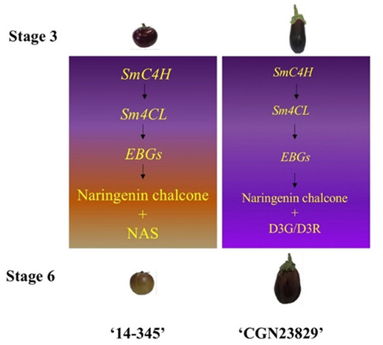 Proposed model underlying the fruit color changes in ‘14-345’ and ‘CGN23829’. The font size of ‘SmC4H’, ‘Sm4CL’ and ‘EBGs’ corresponds to the expression levels. The font size of ‘Naringenin chalcone’, ‘NAS’ and ‘D3G/D3R’ indicates the contents.
