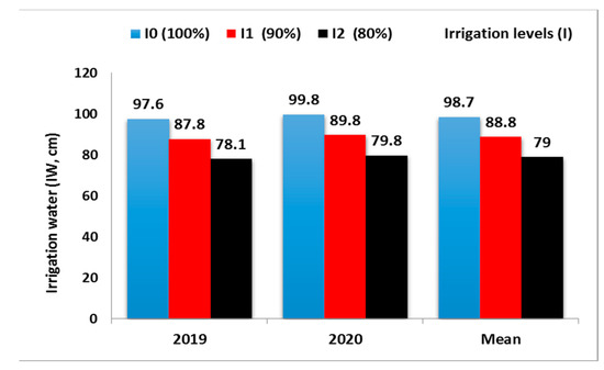 As shown in Figure 1, there were three water irrigation levels as follows: I0 included the amount of applied water requirements (100%) for soybean crop, depending on the official recommendations of the Egyptian Ministry of Agriculture and reclaimed soil. I0 (100%) reached 9760 m3 ha−1 and 9980 m3 ha−1 during both 2019 and 2020, respectively. I1 (90%) from water requirements reached 8780 m3 ha−1 and 8980 m3 ha−1 during the 2019 and 2020 seasons, respectively. I2 (80%) was 7810 m3 ha−1 and 7980 m3 ha−1, respectively, in the 2019 and 2020 seasons. The amount of irrigation water for different weed control treatments was the same under every irrigation level.