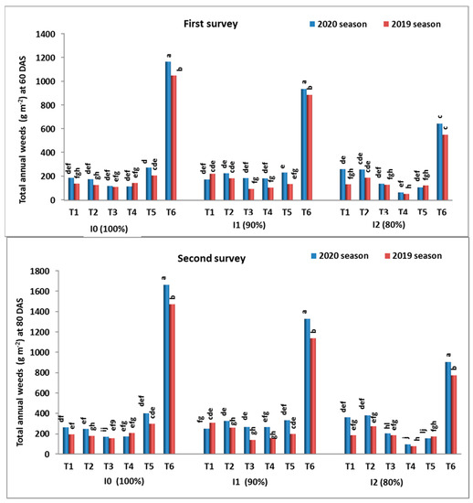 Effect of interactions between irrigation levels and weed control treatments on total annual weeds (g m−2) in the first survey and second survey during the two seasons. I0: 100% irrigation level T1: pendimethalin CS 45.5% T4: imazethapyr WG 60%; I1: 90% irrigation level T2: oxyfluorfen EC 24% T5: hand-hoeing twice; I2: 80% irrigation level T3: bentazon AS 48% + clethodim EC 12.5% T6: untreated check. Different letters represent significant differences (0.05).