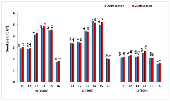 Effect of interaction between irrigation levels and weed control treatments on seed yield of soybean in the 2019 and 2020 seasons. I0: 100% irrigation level, T1: pendimethalin CS 45.5%, T4: imazethapyr WG 60%; I1: 90% irrigation level, T2: oxyfluorfen EC 24%, T5: hand-hoeing twice; I2: 80% irrigation level, T3: bentazon AS 48% + clethodim EC 12.5%, T6: untreated check. Different letters represent significant differences (0.05).