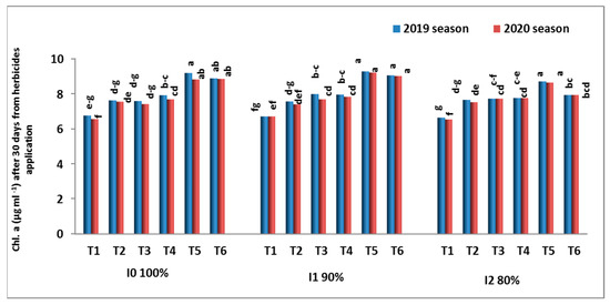 The results presented in Table 9 and Figure 4 showed no significant differences among the three irrigation levels on both Chl a and b in the first sample (30 days from application) in the two seasons, while significant differences between them were observed in the second sampling (60 days after application), where I1 (90%) recorded the highest concentrations of Chl a (10.25 and 9.12 µg mL−1) and Chl b (4.44 and 4.40 µg mL−1) in the two seasons, respectively, while I2 (80%) gave the lowest Chl a (8.206 and 7.11 µg mL−1) and Chl b (3.05 and 3.92 µg mL−1) in the two seasons, respectively. Regarding weed control treatments, (T5) hand-hoeing twice recorded the highest values of both Chl a (10.05 and 9.88 µg mL−1) and Chl b (3.73 and 3.80 µg mL−1) in the two seasons, respectively, followed by T6 untreated check treatment (9.62 and 9.59 µg mL−1). Chemical weed control treatments gave the lowest values of chlorophyll pigments a and b in the 2019 and 2020 seasons in the first sample. The results of the second sample (60 days from application) showed that imazethapyr at 57.12 g a.i. ha-1 (T4) and hand-hoeing twice gave the highest values of Chl a (10.38 and 10.03 µg mL−1) in the first season and (10.00 and 9.082 µg mL−1) in the second one and Chl b (4.119 and 4.030 µg mL−1) in the first season and (4.04 and 4.12 µg mL−1) for imazethapyr (T4) and hand-hoeing twice, respectively.