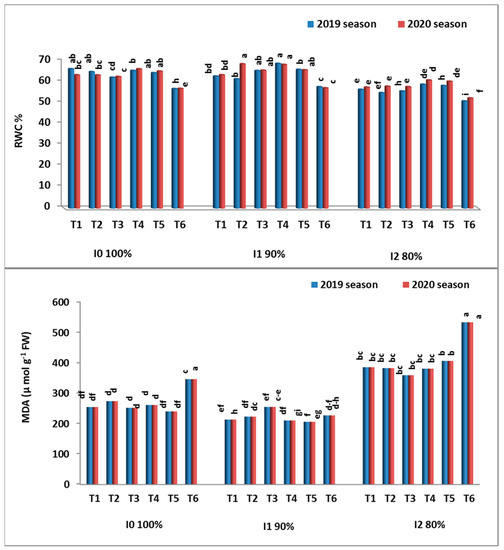 Effect of interactions between irrigation levels and weed control treatments on RWC% and MDA during the 2019 and 2020 seasons; I0: 100% irrigation level T1: pendimethalin CS 45.5% T4: imazethapyr WG 60%; I1: 90% irrigation level T2: oxyfluorfen EC 24% T5: hand-hoeing twice; I2: 80% irrigation level T3: bentazon AS 48% + clethodim EC 12.5% T6: untreated check. Different letters represent significant differences (0.05).