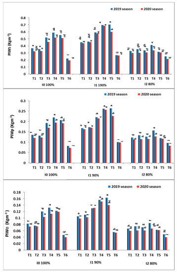 Effect of interactions between irrigation levels and weed control treatments on productivity of irrigation water PIWs, PIWo, and PIWp in the 2019 and 2020 seasons. I0: 100% irrigation level T1: pendimethalin CS 45.5% T4: imazethapyr WG 60%; I1: 90% irrigation level T2: oxyfluorfen EC 24% T5: hand-hoeing twice; I2: 80% irrigation level T3: bentazon AS 48% + clethodim EC 12.5% T6: untreated check; PIWs: productivity of irrigation water based on seed yield; PIWo: productivity of irrigation water based on oil yield; PIWp: productivity of irrigation water based on protein yield. Different letters represent significant differences (0.05).