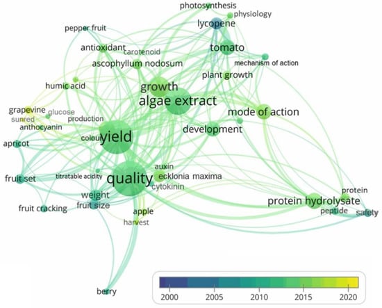 Using VOSView bibliographic analysis software, Rodrigues et al. [69] examined the titles and abstracts of professional articles (Figure 1). The figure shows the most common words related to the topic of biostimulants. The colors indicate the year numbers. Although the fruit and vegetable sectors were examined, the result was that one of the most researched areas was ‘algae extract’ [69].