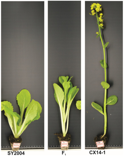 Phenotype of ‘CX14-1’ (P1, early-bolting), ‘SY2004’ (P2, late-bolting) and their F1 (mid-bolting).