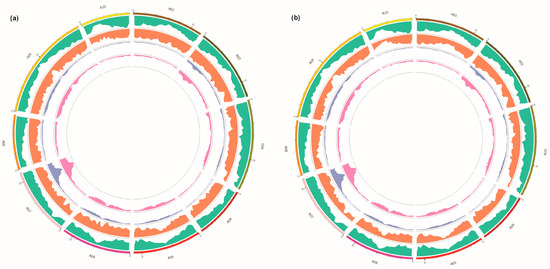 A total of 64.24 Gb reads were generated by whole-genome re-sequencing. After filtering, we obtained a total of 63.58 Gb clean reads with 40.61x coverage, of which 98.57% were mapped to the Chinese cabbage reference genome Brassica rapa (Chiifu-401) v3.0 version reference genome (Brassica database (BRAD), http://brassicadb.org/brad/ (accessed on 28 January 2021)), while the genome coverage was 94.12% and the average coverage depth was 27.25x. A total of 1580,458 SNPs were obtained between the two parents (‘SY2004’ and ‘CX14-1’), of which 113,067 (7.15%) SNPs were non-synonymous, while 167,793 SNPs were obtained between the two bulks (EB bulk and LB bulk). Of these, 8722 (5.2%) SNPs caused non-synonymous mutations (Table S1). Moreover, a total of 557,544 and 62,777 small InDels were obtained between the two parents and two bulks, respectively (Table S2). With the SNP-index correlation algorithm, a candidate region related to traits was obtained, with a total length of 5.22 Mb. Furthermore, the SNP and InDel variations of the samples and BSA correlation analysis results were plotted using ‘Circos’ (http://circos.ca/ (accessed on 28 January 2021)) and are shown in Figure 2.
