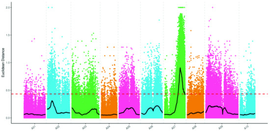 Mapping BrEb-1 by the Euclidean distance (ED) algorithm, using the SNP approach. The abscissa represents the chromosome name; the colored dots represent the ED value of each SNP locus; the black line indicates the fitted ED value; the red dashed line represents the significant correlation threshold (threshold = 0.43). The higher the ED value, the greater the effect.