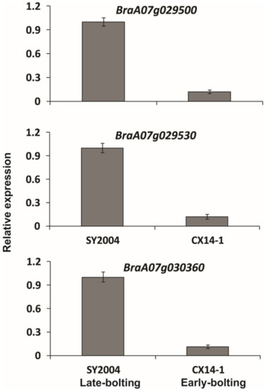 A total of 887 genes were annotated in the candidate region, among which there were 557 non-synonymous mutant genes annotated between parents and 147 frameshift mutant genes (Table S5). Moreover, within the 4.89 Mb region on chromosome A07, 2321 and 1526 SNPs with non-synonymous mutations were obtained between the parents and the mixed pools, respectively (Table S5). These SNPs are likely to be directly related to BrLb-1. Likewise, 229 and 131 InDels with frameshift mutations were found between the parents and the bulk pools, respectively, which were likely to be directly related to the BrLb-1 (Table S5). Additionally, we checked the expression of these candidate genes via RT-qPCR using gene-specific primers (Table S7). The results showed that the transcript levels of these genes were up-regulated in late-bolting compared to early-bolting genotypes (Figure 7).