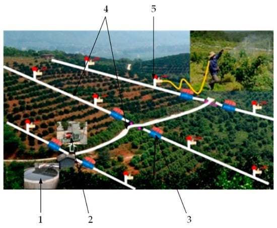 Schematic diagram of hillside orchard pipeline spraying. 1. Water pool. 2. Mixer. 3. Water valves. 4. Pipes. 5. Spray valves.