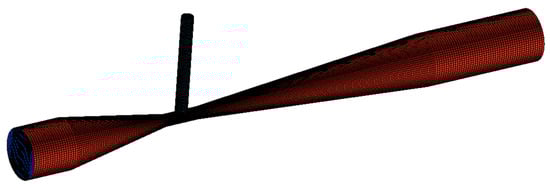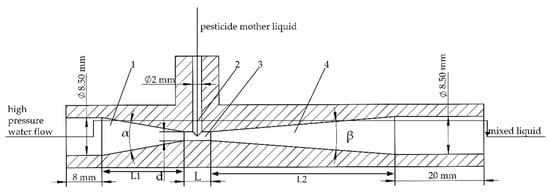 Jet-mixing apparatus is characterized by no requirement of extra power, compact structure, convenient operation, and low cost. Compared with other pesticide mixing apparatus, jet-mixing apparatus has the advantages of strong mixing, reliable working performance, quick mixing, and so on [,]. Therefore, the mixing principle of jet-mixing apparatus is adopted as reference in the paper; the actual dimension of hose diameter in pipeline spraying is combined to design the basic structure of on-line pesticide mixing apparatus based on pipeline spraying, as shown in Figure 2. Here, the diameter of water inlet and mixture outlet is 8.5 mm, the diameter of the pesticide mother liquid inlet is 2 mm, and the diameter is matched with the dimension of the spray gun hose in practical application at a flow rate of 10 L/min in the corresponding size; the length of the constricted tube L1 is 15 mm, the length of the diffusion tube L2 is 42 mm.