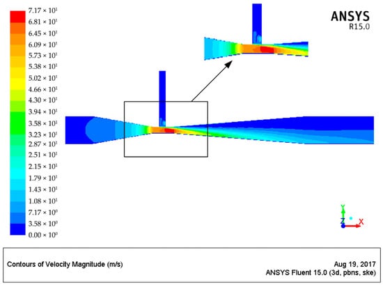 Figure 4 and Figure 5 are combined. It is obvious that as low velocity high pressure water flow penetrates through the constricted tube with a gradually decreased cross section area, velocity is gradually increased, pressure is gradually decreased, and it is changed into a high-velocity low pressure water flow. Velocity reaches its maximum value in the Venturi, and pressure reaches the minimum level, thereby forming negative pressure; the pesticide mother liquid is sucked from the suction chamber into the pesticide mixing apparatus under the effect of the strong external barometric pressure and static pressure of the liquid. Two liquid flows with different velocities exchange energy in the Venturi, water flow rate is reduced, the flow rate of pesticide mother liquid is increased, and they are gradually and evenly mixed. Since the cross-section area of the diffusion tube is gradually increased, some kinetic energy is converted into pressure energy, mixed liquid flow rate is gradually decreased, and pressure is gradually increased, which is accompanied by certain velocity layering. Zhou et al. [] have also concluded that the cross-sectional area can influence the suction performance of the mixing device, and that the best suction performance can be achieved with an area ratio between 1.0 and 1.6, but that the suction performance will gradually deteriorate when the area ratio exceeds 2.0.