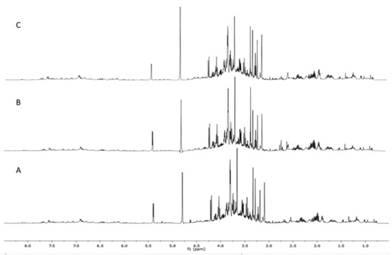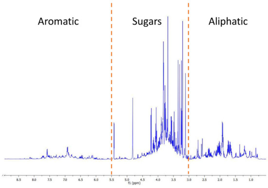 All 1H-NMR spectra of the samples revealed by visual inspection a similar peak distribution between δ 0.8 and 8.5 ppm. The main signals were detected in the high field or aliphatic (δ 0.5–3.0 ppm) and midfield or sugars (δ 3.0–5.5 ppm) regions, but signals were also identified in the low field or aromatic region (δ 5.5–9.0 ppm), as shown in Figure 2.