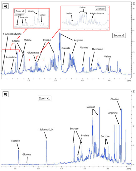 Already in the low field or aromatic region (δ 5.5–8.5 ppm), normally associated with aromatic groups of amino acids and phenolic compounds, were low-intensity signals associated with formic acid (δ 8.56 ppm) and with trigonelline (as a doublet at δ 8.85 and 9.16 ppm). Although to the knowledge of the authors no specific bibliographical references have been found on the metabolomic study of foliar samples of C. limon var. ‘Verna’, the results obtained are consistent with the available literature on leaf samples [27,28].
