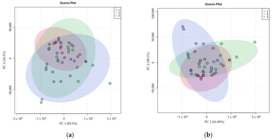 Principal component analysis (PCA) graphs of the metabolomic study of lemon leaves (Citrus limon var. ‘Verna’) cultivated in 9 different treatments (3 rootstocks × 3 substrates) differentiating (a) according to the substrate used, and (b) depending on the rootstock.